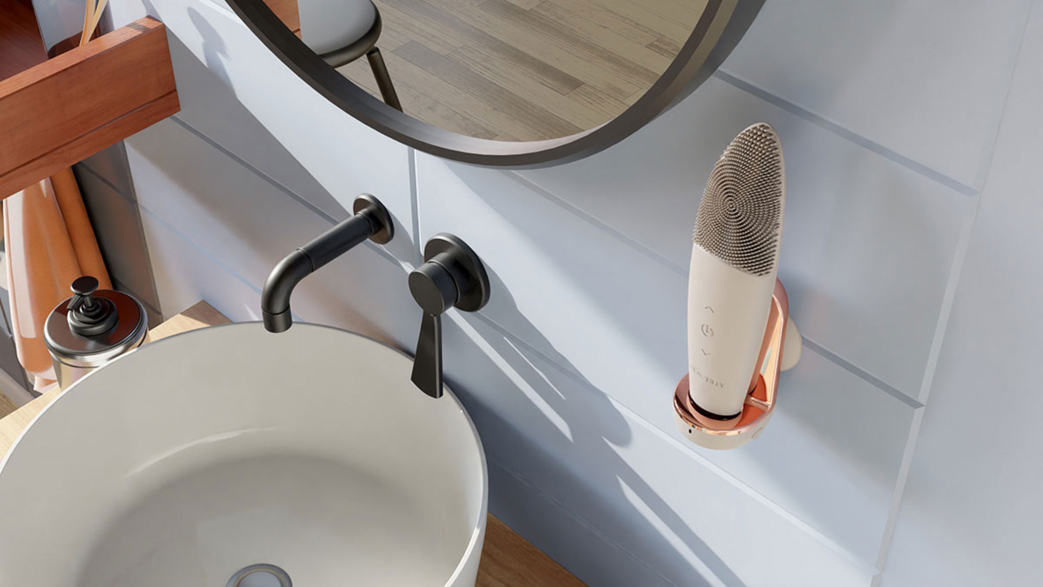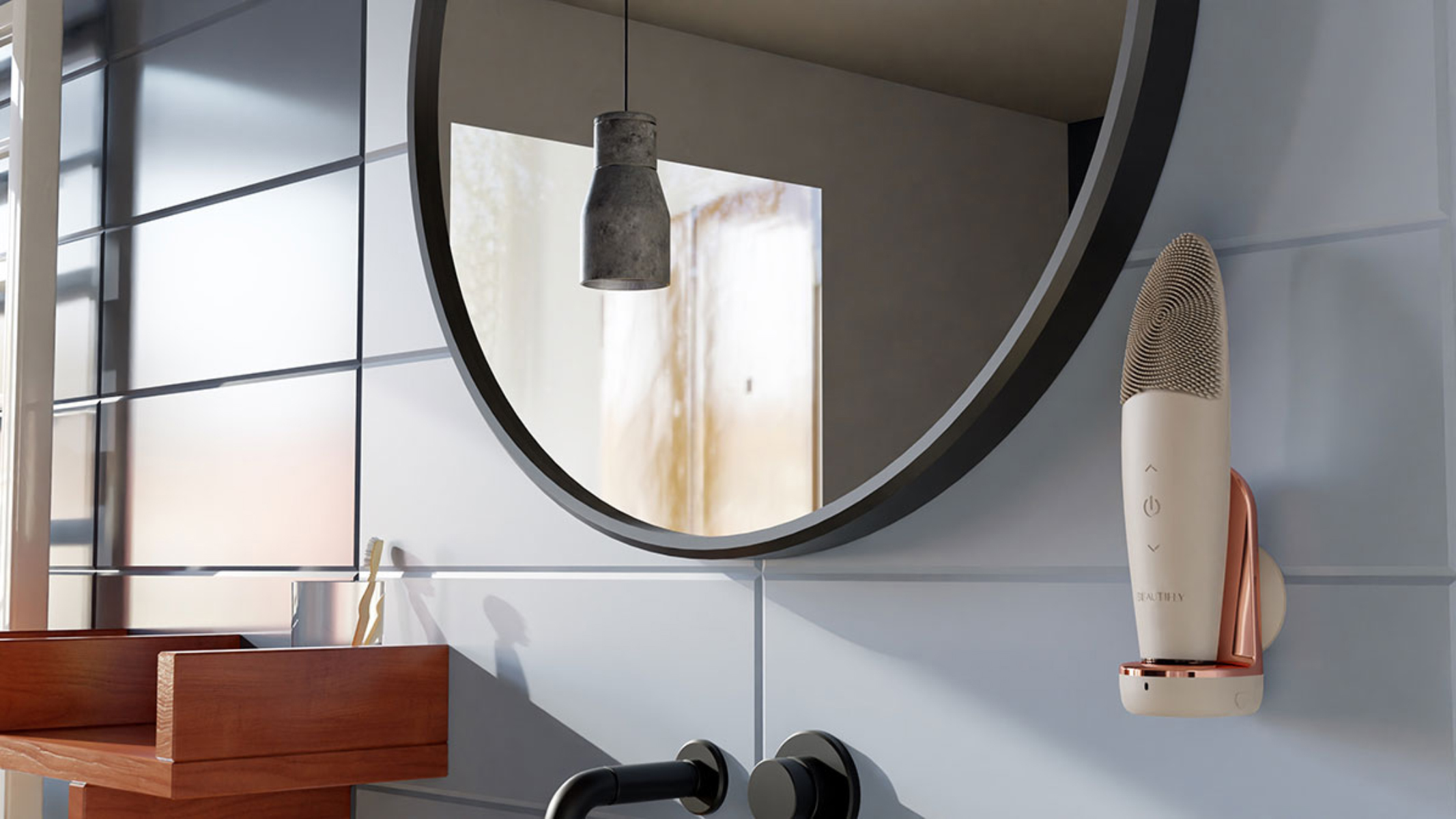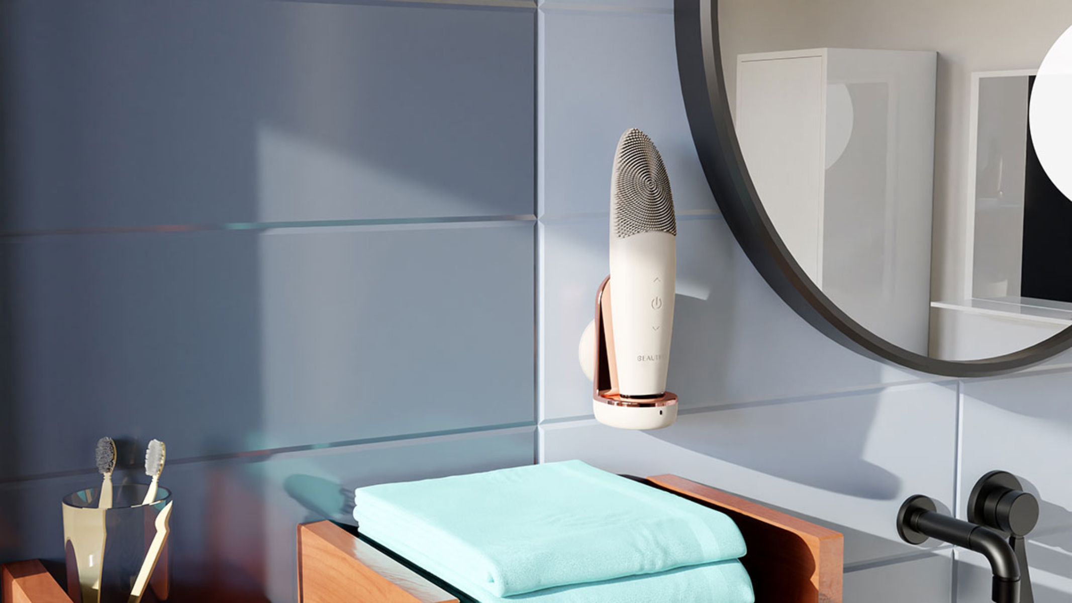 Nie masz miejsca w swojej łazience, czy przy umywalce? Nic straconego! Szczoteczkę B-Clean z łatwością przymocujesz obok lustra. Dzięki temu masz ją zawsze pod ręką, a odsunięta od umywalki pozostaje w czystości.