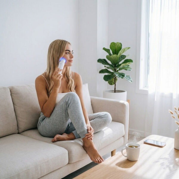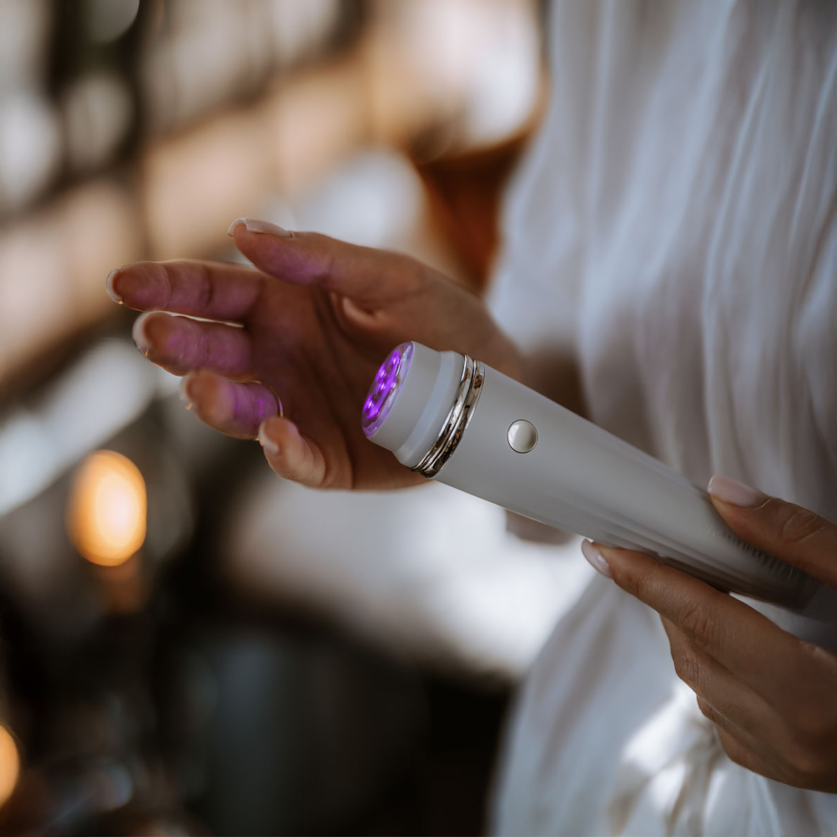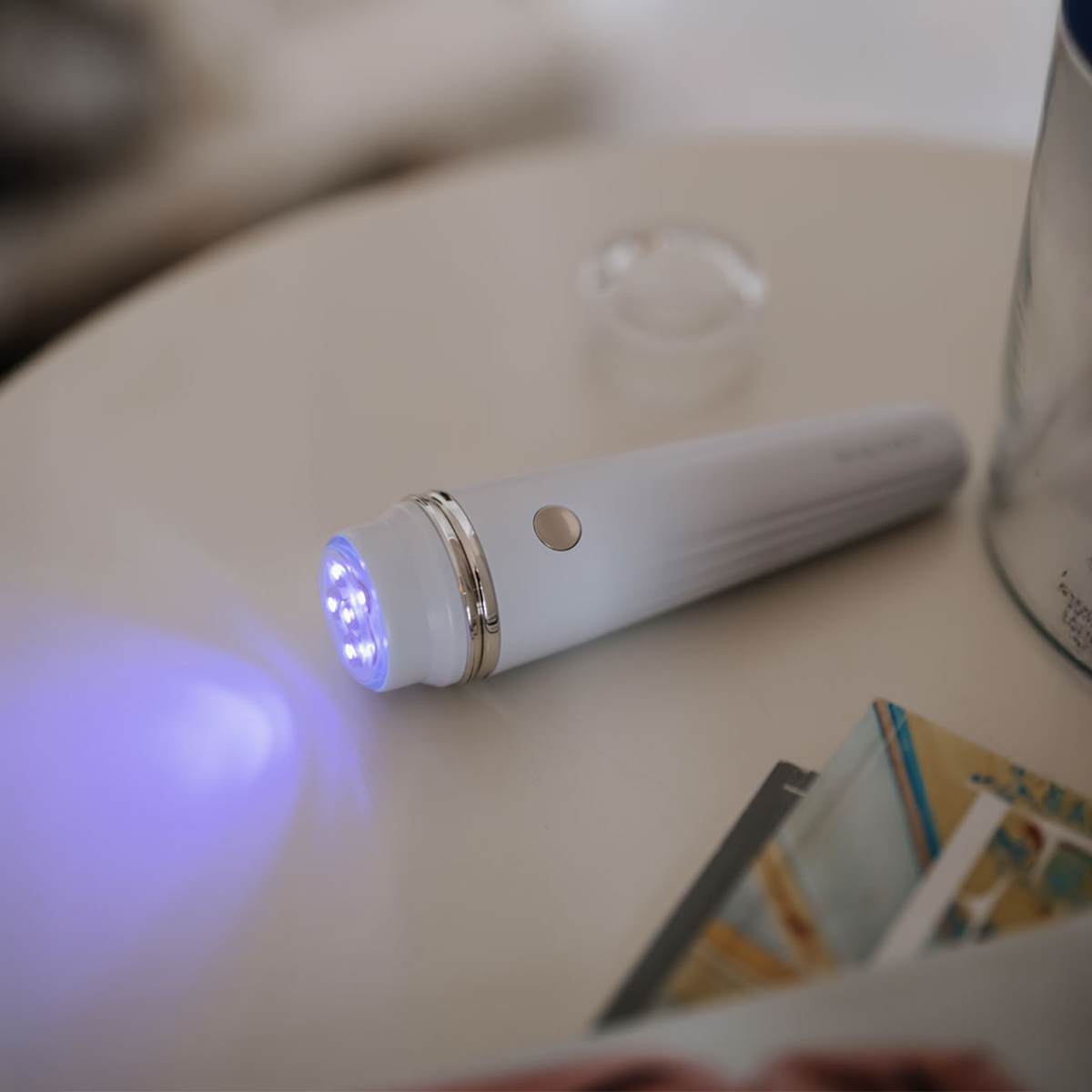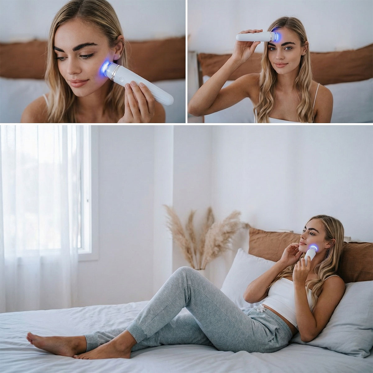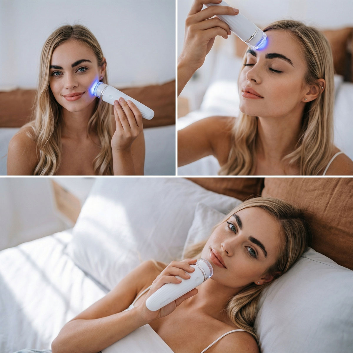 Niebieskie światło LED emitowane przez to urządzenie ma właściwości zwężające pory, co prowadzi do poprawy wyglądu skóry.