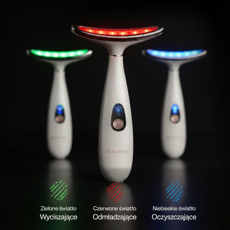 Terapia LED łączy trzy barwy światła, które działają na różne problemy skóry. Wspólnie przywracają skórze świeżość i zdrowy wygląd, widoczny już po kilku użyciach. Niebieskie światło działa antybakteryjnie i przeciwzapalnie wspomaga leczenie zmian trądzikowych i reguluje wydzielanie sebum. Czerwone światło pobudza komórki do odnowy i zwiększa produkcję kolagenu. Poprawia mikrokrążenie, wygładza zmarszczki i nadaje skórze jędrność. Zielone światło łagodzi podrażnienia, wyrównuje koloryt i rozjaśnia przebarwienia. Wspiera mikrokrążenie i drenaż limfatyczny, redukuje obrzęki i zaczerwienienia.